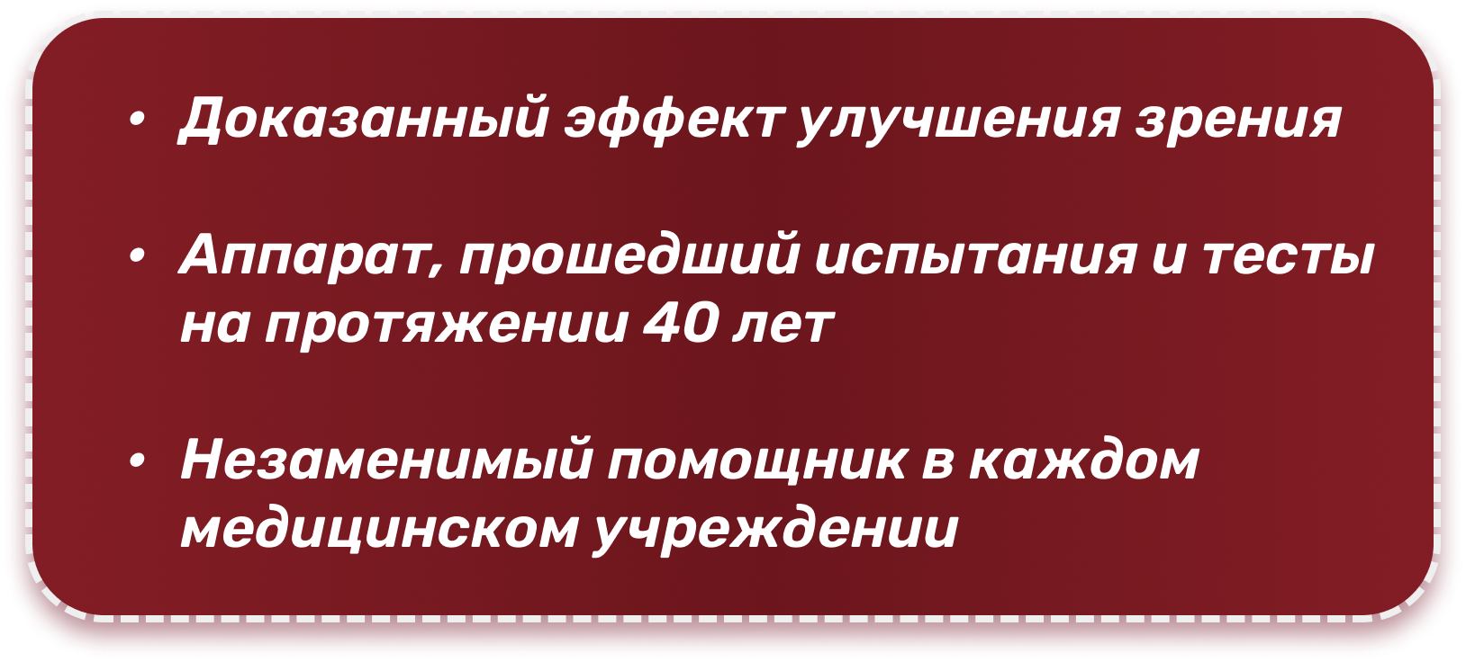 Предназначен для диагностики, лечения и профилактики зрительного утомления и различных заболеваний органа зрения, а также проведения цветотерапии, офтальморефлексотерапии. Действие аппарата основано на стимуляции органа зрения световыми сигналами различной яркости, длины волны и частоты.